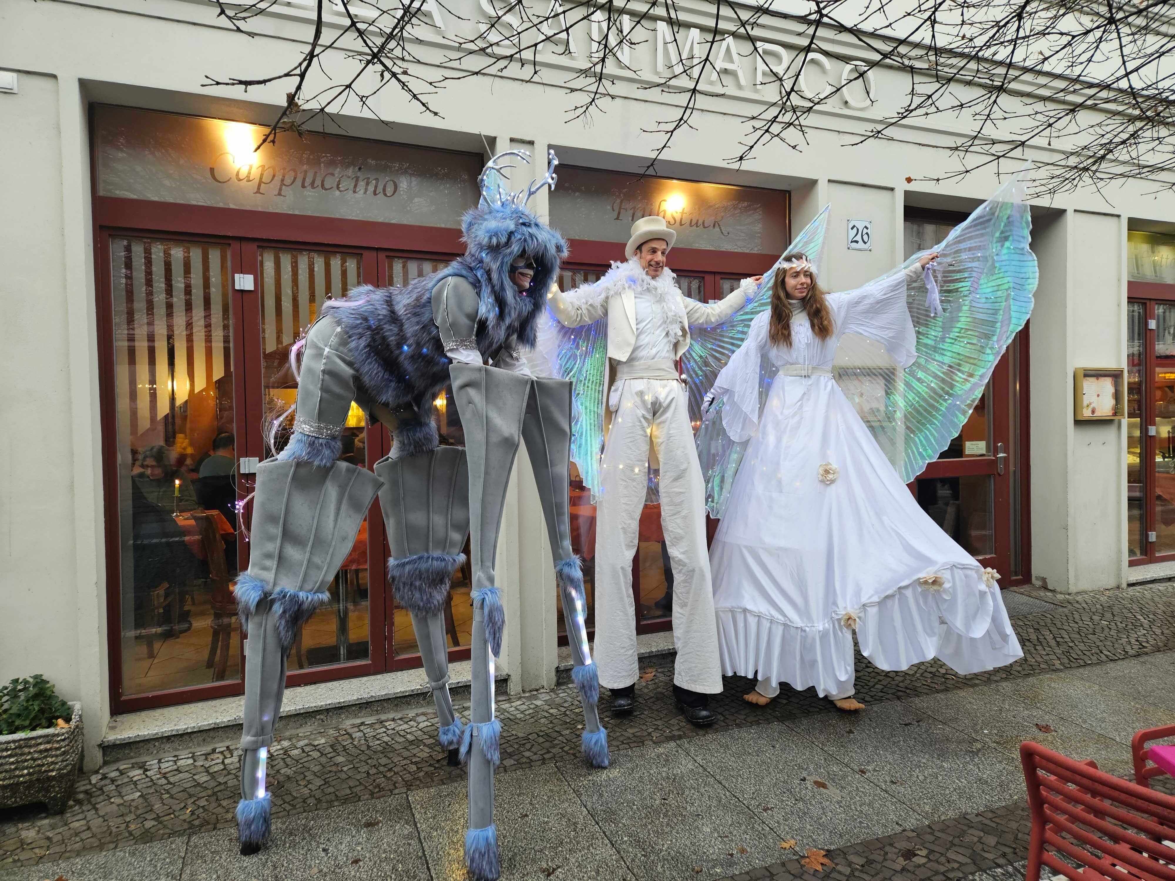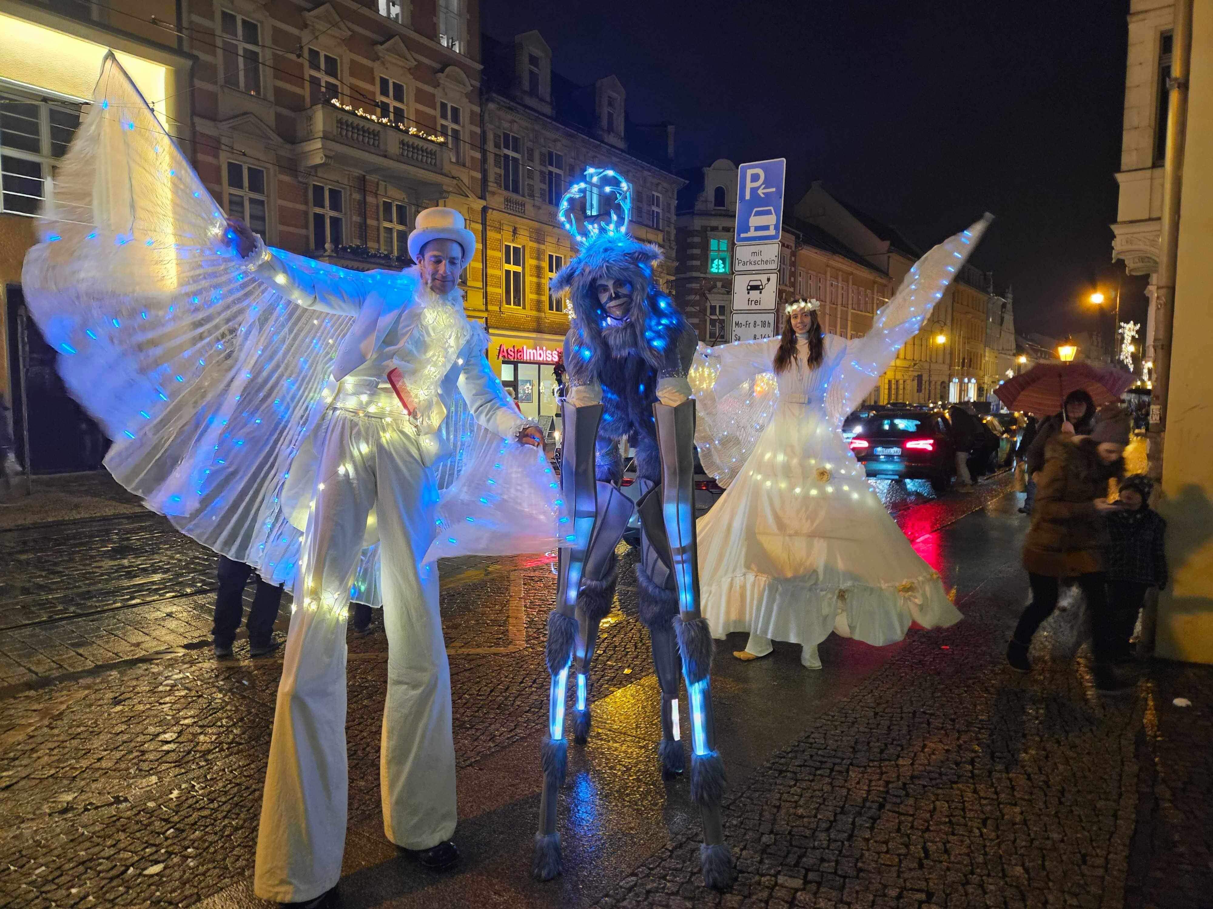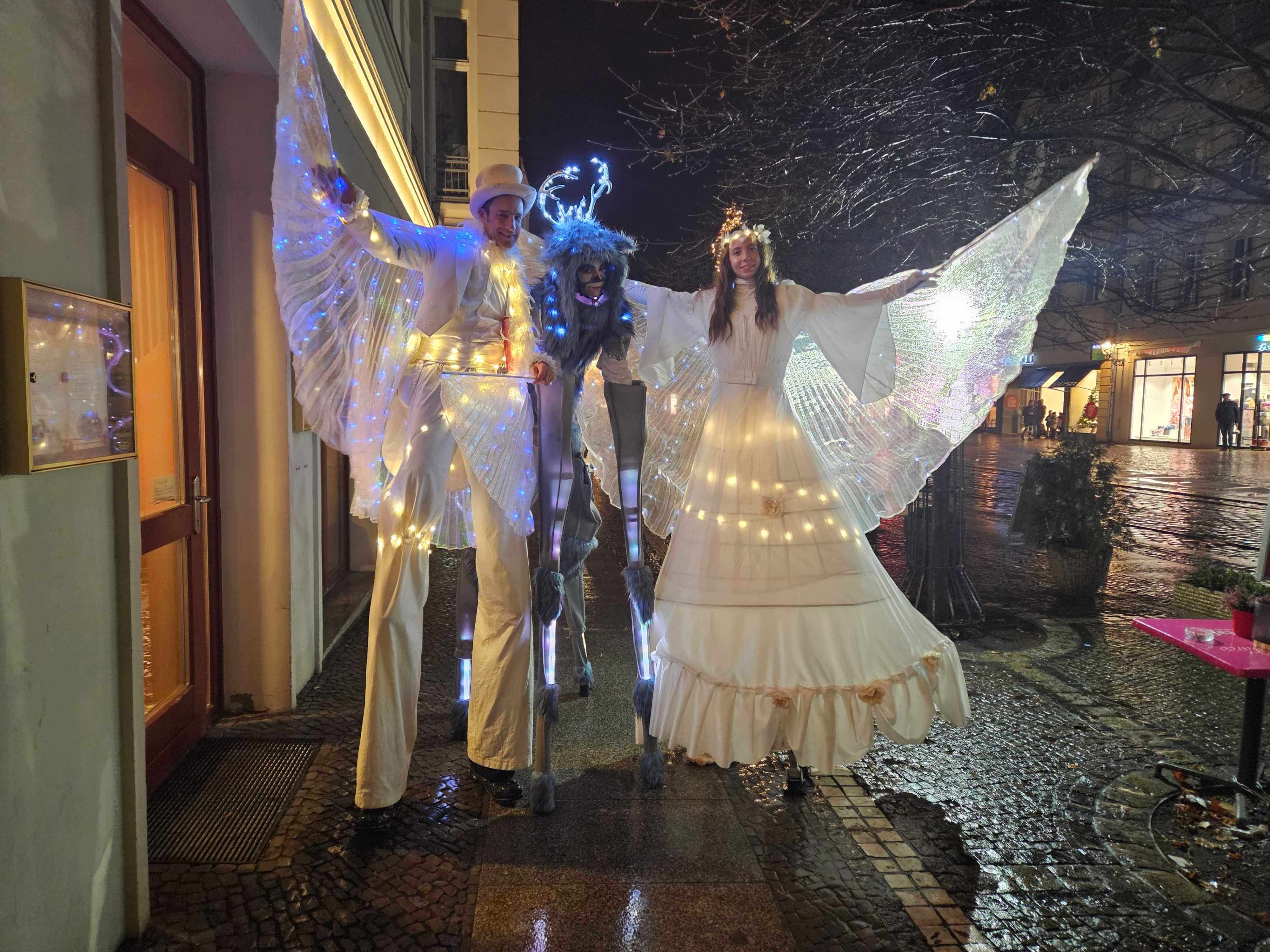 Am Sonntag, dem 14. Dezember, wird es märchenhaft, bunt und magisch: Mit Lichterglanz und Lichterzauber kommen Eis-Engel auf Stelzen in die Innenstadt daher. Alle Figuren erstrahlen in hellem LED-Licht und halten einiges an Überraschungen bereit.
